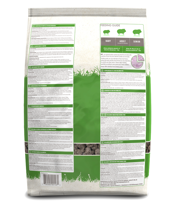 Un cochon d’Inde adulte de taille moyenne aura besoin de 40-50 g/jour de Selective Guinea Pig Botanicals. Des légumes frais doivent aussi être mis à disposition, ainsi que du foin de bonne qualité et de l’eau potable propre. Conserver dans un endroit frais et sec.