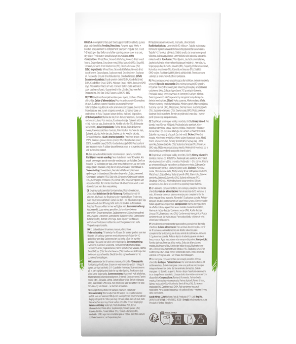 Farine de blé, foin de luzerne moulu, graines de caroube séchées moulues, pois moulus, farine de soja, épinards séchés (4%), huile de soja, graines de lin, myrtilles séchées moulues (1%), échinacée séchée (1%).