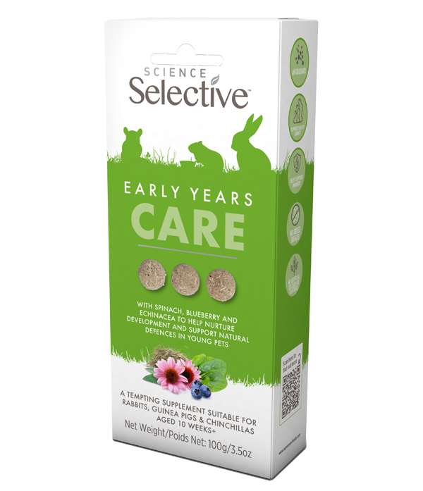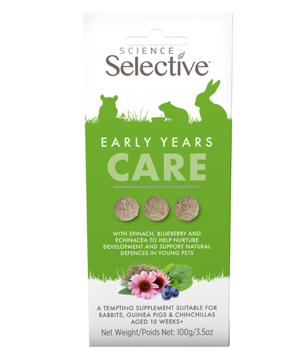 Les compléments alimentaires Science Selective Early Years Care sont formulés pour favoriser la croissance et renforcer les défenses naturelles des jeunes animaux grâce aux épinards, aux myrtilles et à l’échinacée.